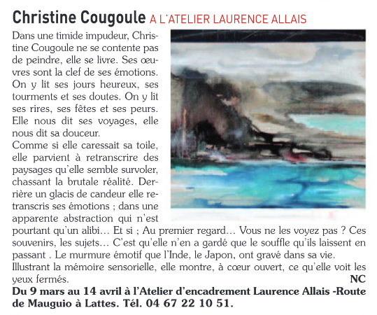 Christine vous invite par sa peinture à lire ou écrire l'histoire d'une rencontre, d'une émotion : plonger dans son univers, c'est plonger dans la vie, tout simplement.